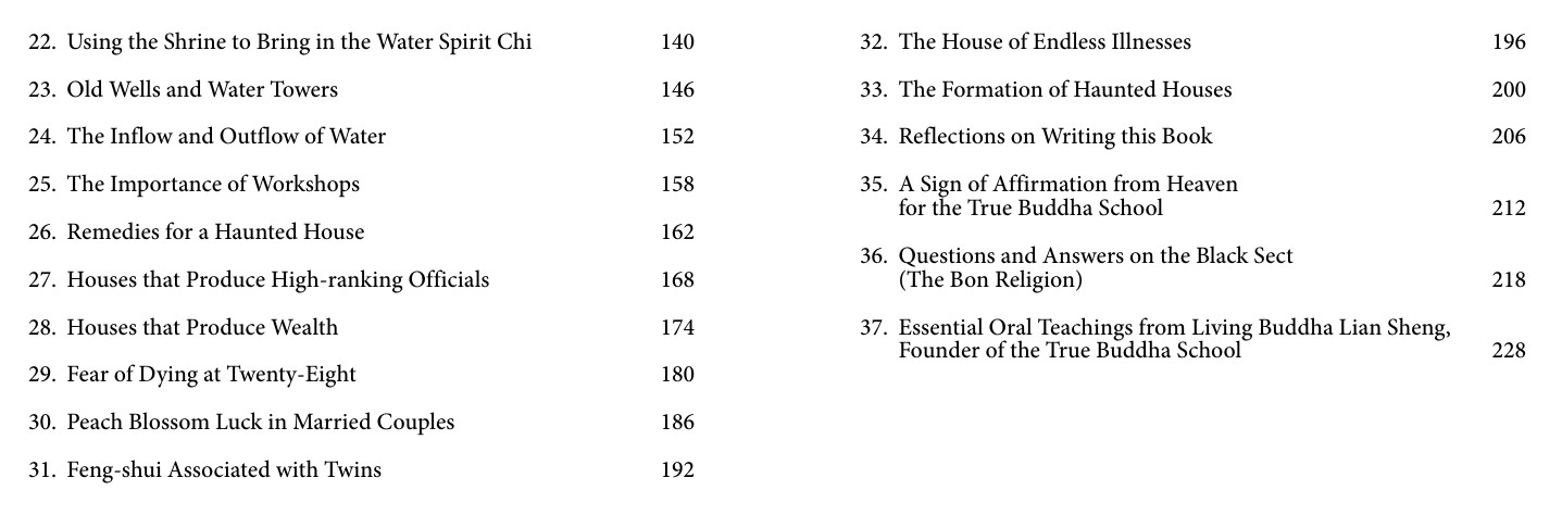 I hope the writing of this book will offer an impartial and systematic view offeng-shui that will be of practical value to its readers. This resource book reveals that my teachings do not lean toward total renunciation of worldly affairs but are an amalgamation of both “transcendental” and “worldly” Dharmas. The publication of this book is an offering of boundless blessings to all my students and readers. It is my wish that everyone will attain good health and longevity, auspiciousness, a harmonious family life, an increase in wisdom andfortune, and fruition in spiritual cultivation.