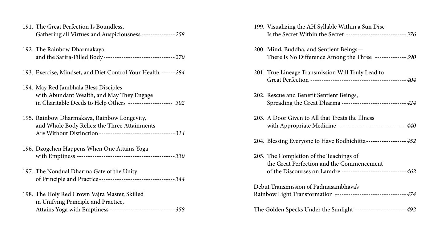 “The teachings of Great Perfection are the pinnacle of Tantrayana teaching, just as Mount Everest or Shengmu Feng in the Himalayas is the highest summit in this world. The ultimate fruition of Great Perfection Dharma is the rainbow body phenomenon. Padmasambhava transformed his body into a rainbow and vanished into empty space. In our school, we have the third highest achievement in Master Lianhua Yimin whose cremated body left behind a multitude of sariras. The second highest achievement is the body transforming into rainbow light, with clothing, hair, fingernails and toenails left behind. That is why Great Perfection teachings are the highest teachings.”